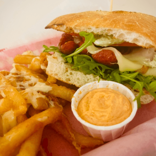 Ham, mozzarella, tomato, lettuce & bell pepper mayo. Brioche bun with French fries