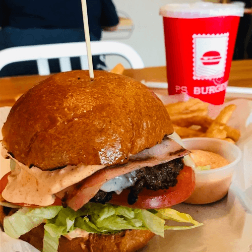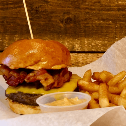 Smoked bacon, Cheddar & BBQ sauce. Brioche bun with French fries