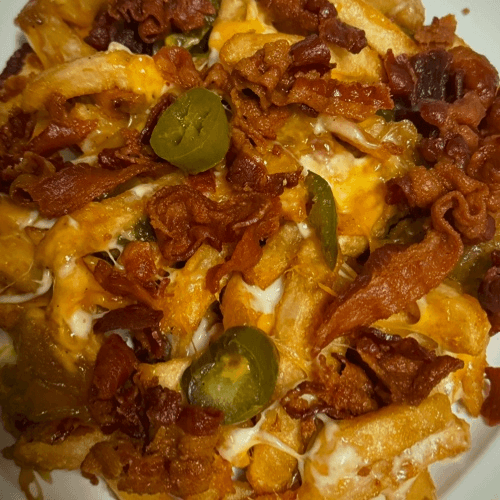 Fries Topped with Bacon, Caramelized Onions, Jalpeños, Cheddar, and Mozzarella Cheese.
