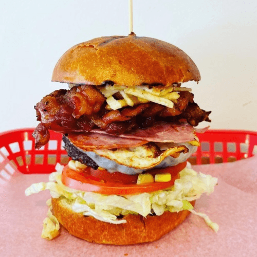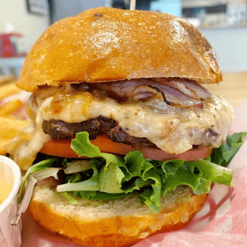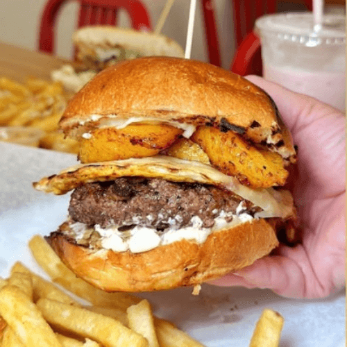 Grilled pineapple, fried onion ring, smoked bacon, red bell peppers, American cheese & cayenne ranch sauce. Brioche bun with French fries