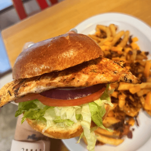 Grilled chicken, avocado, lettuce, tomato, gruyere & basil aioli. Served with French fries