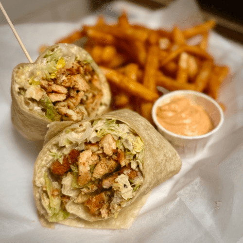 Crispy Chicken, Lettuce, Tomatoes, Sliced Avocado and Mayo. Wrapped in a White Flour Tortilla.