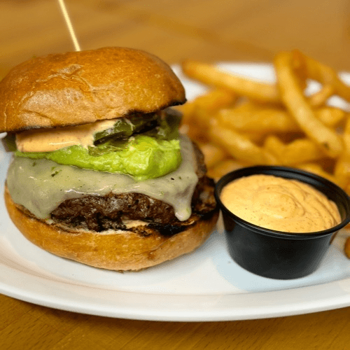 Fried jalapeño, avocado, pepper jack & chipotle sauce. Brioche bun with French fries